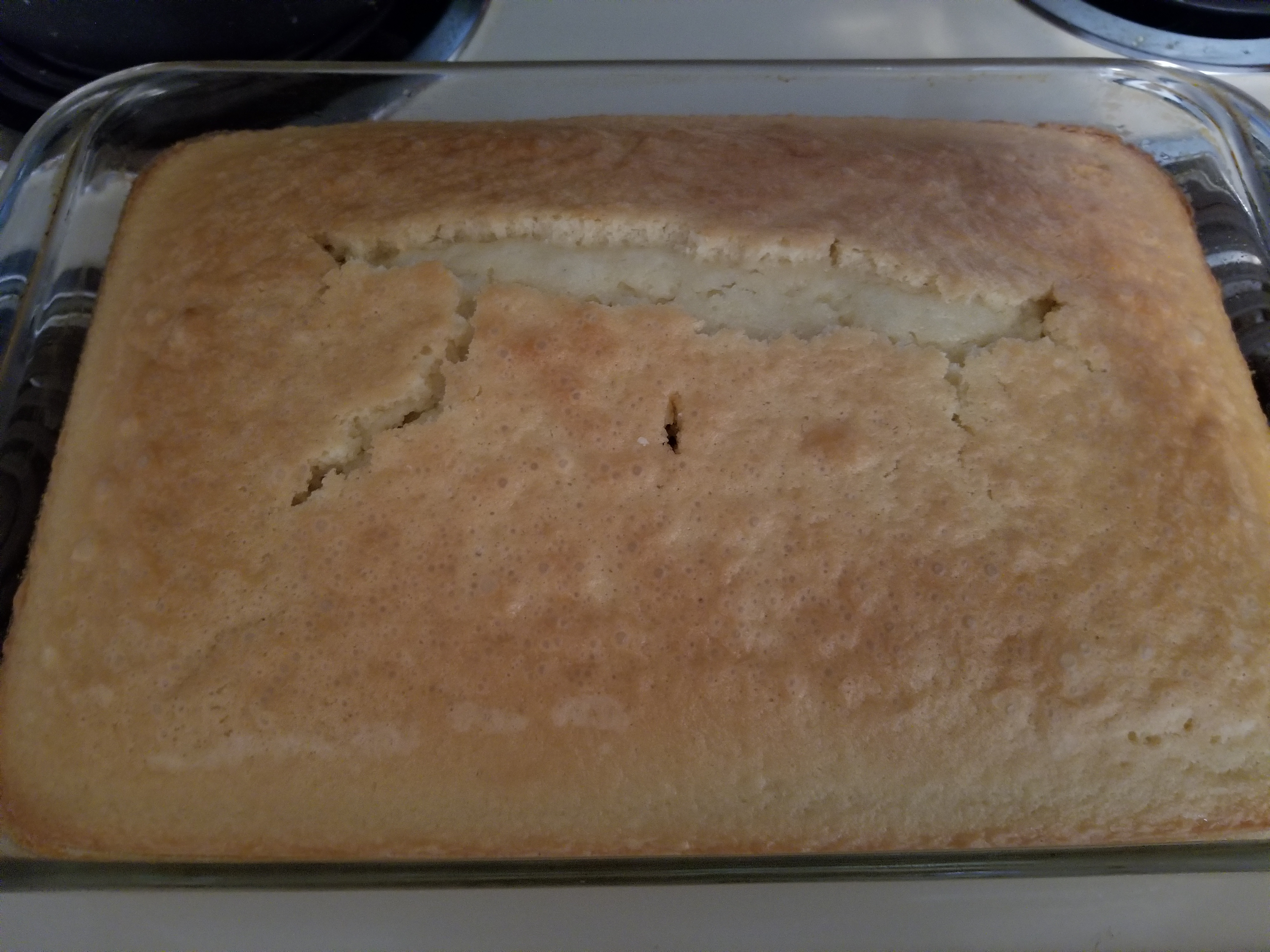 Mixed the dry ingredients, then the wet, one egg at a time. Baked 350 for 40 minutes in a 13×9 pan, greased liberally with coconut shortening.