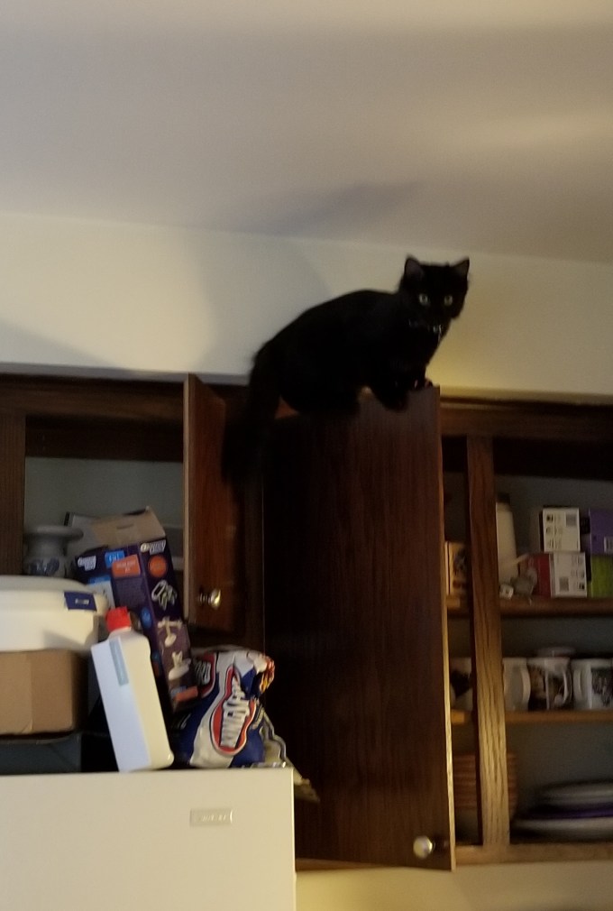 He then tried to leap into the cabinet but missed and slid down, kind of bounced off the counter and landed on the floor. I then cleared off the fridge so I could shut the doors to prevent such an occurrence from happening again. It will probably happen again.