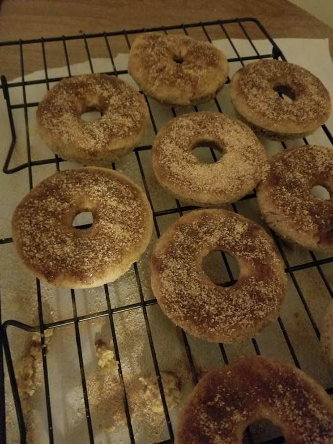 If I had half a brain I would have put a 1/4 tsp xanthan gum in, but I didn’t so they’re crumbly but so so delicious. Dipped in melted earth balance and cinnamon sugar.