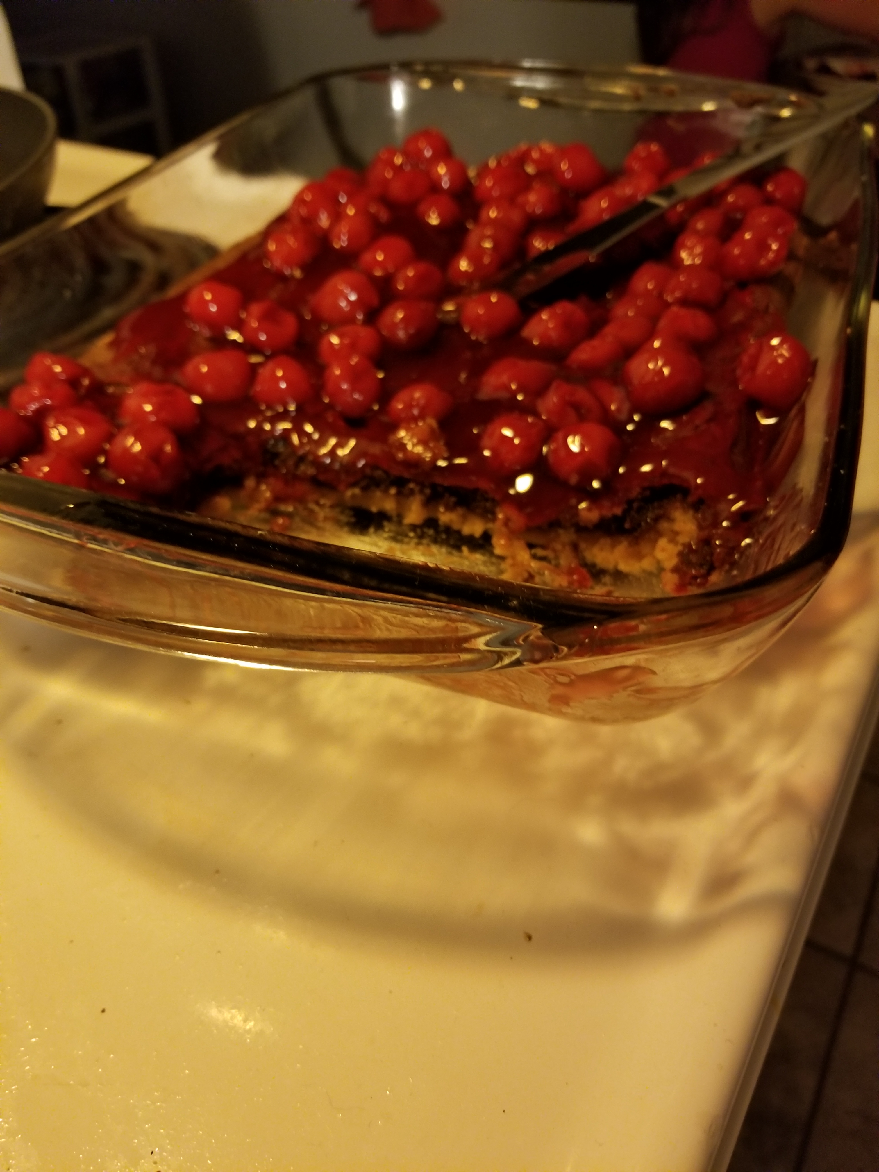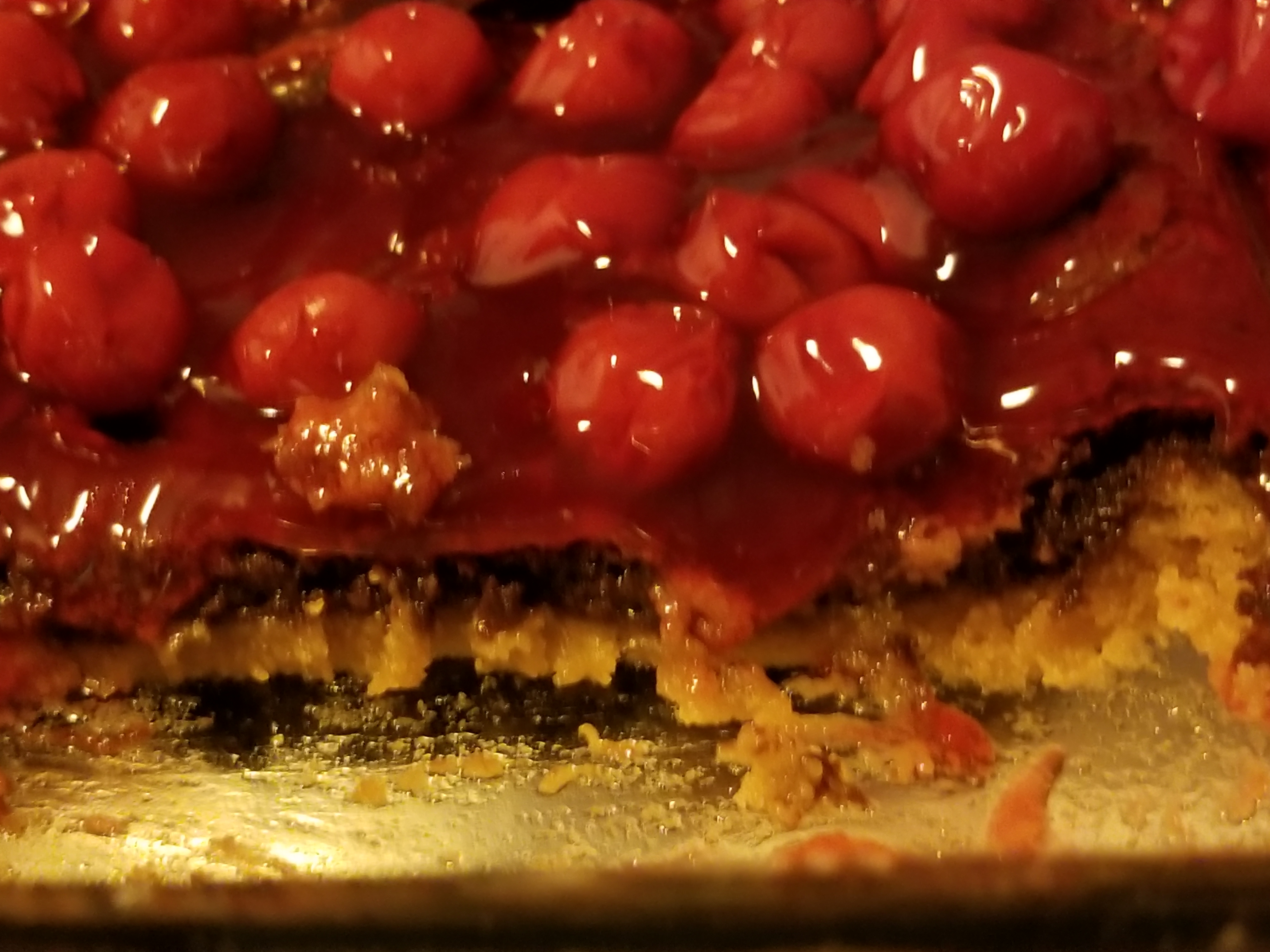 I layered this on top of the vanilla layer, baked at 350f for 30 minutes. I feel like it needed an extra 5 though, because it was a tad undertone in the middle, but as you wish. Cooled, then slapped the can of cherry pie filling on top. Next time I might whip the pie filling in with some coconut whipped cream.